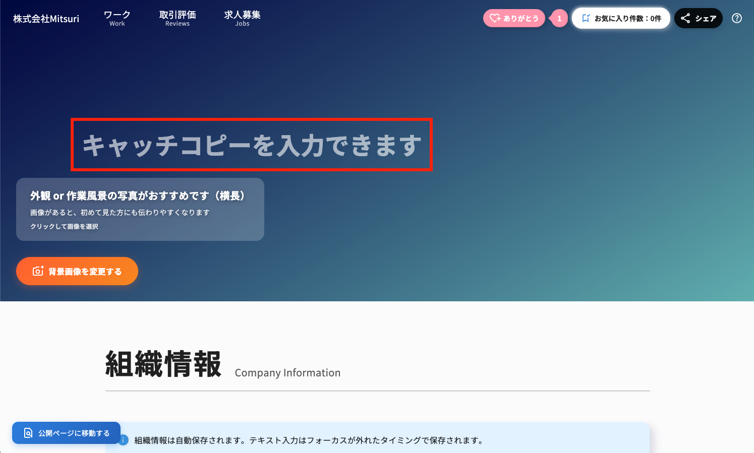 貴社のイメージをひとことで伝えられるキャッチコピーを登録しましょう。